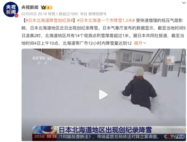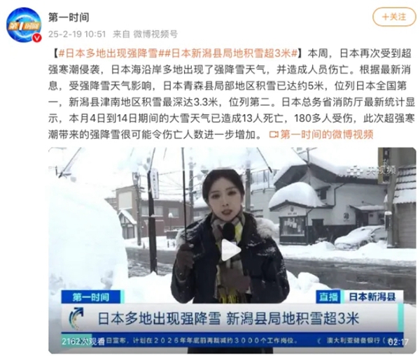 本月4日起,日本多地遭遇今冬以來最強寒潮,達十年一遇級別,且持續(xù)數日,部分地區(qū)降雪達“災害級”。另據中央廣播電視總臺《央視第一時間》最新報道,本周日本再次受到超強寒潮侵襲,日本海沿岸多地出現強降雪天氣。其中,日本青森縣局部地區(qū)積雪已達約5米,位列日本全國第一,新潟縣津南地區(qū)積雪最深達3.3米,位列第二。日本總務省消防廳最新統(tǒng)計顯示,本月4日到14日期間,大雪天氣造成13人死亡,180多人受傷。報道指出,此次超強寒潮帶來的強降雪很可能令傷亡人數進一步增加。
