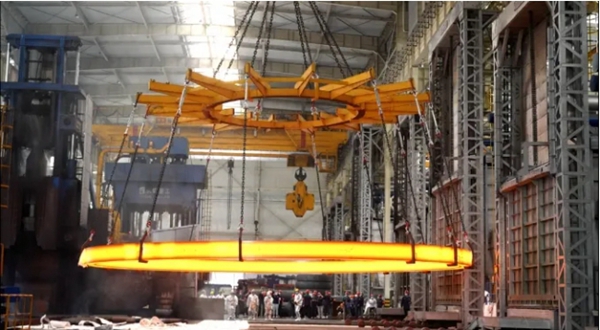 2022年兩件直徑15.6米的“乾坤圈”在伊萊特股份有限公司成功下線,是用于我國某四代核電機組上的巨型鍛件,承載著核電機組堆容器7000噸的重,這個重量相當于‘乾坤圈’腦袋上頂著100節動車組的重量。