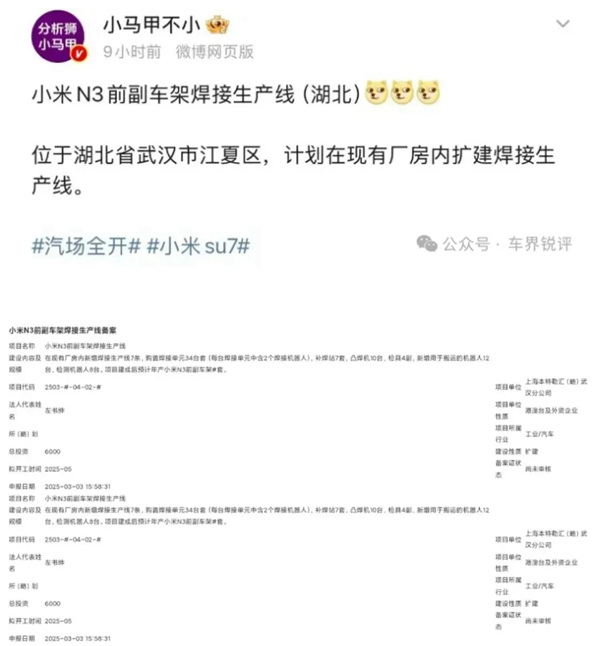 近日,關于“小米N3前副車架焊接生產線備案”的截圖在社交媒體上廣泛流傳,引發業界熱議。不過項目地點不在武漢經開區,而在江夏區。![]() 根據截圖信息,該項目總投資額為6000萬元,屬于擴建項目,由上海本特勒匯(武漢分公司)負責實施,項目代碼為2503-#-04-02#2。項目位于湖北省武漢市江夏區,計劃在現有廠房內擴建焊接生產線,新增7條焊接生產線、34臺焊接單元(含68個焊接機器人)、12臺搬運機器人及8臺檢測機器人等設備,建成后預計年產小米N3前副車架30萬套。項目已于2025年3月3日完成備案審批,擬于2025年5月開工,當前備案狀態尚未審核。