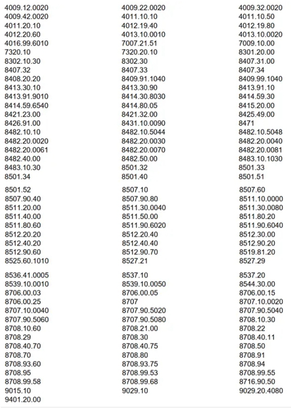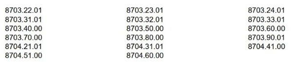 以下進口至美國的產品將會被加征25%關稅:乘用車(轎車、SUV、多用途車、小型貨車和貨車等)和輕型卡車等,上述產品一般歸入以下美國海關商品編碼HTSUS: