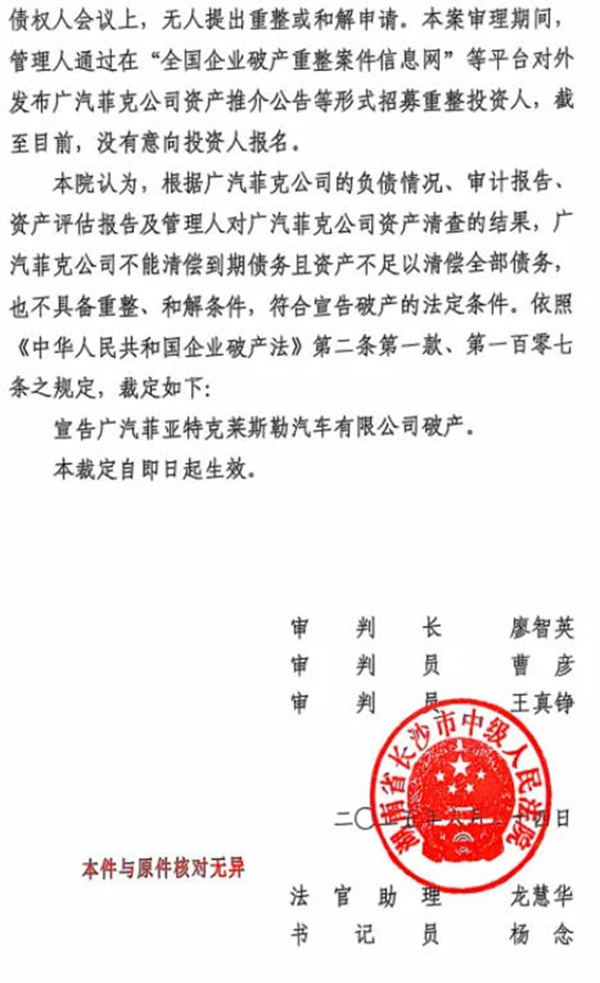7月8日,廣汽菲克管理人發布廣汽菲亞特克萊斯勒汽車有限公司破產清算案進展情況通報。 ![]() 通報稱,因廣汽菲克公司已無重整可能,根據部分債權人意見,經債權人委員會討論,管理人已經申請長沙中院裁定宣告廣汽菲克公司破產。 長沙中院召開的第一次債權人會議上,管理人擬訂的《破產財產分配方案》已經獲得債權人會議表決通過。 長沙中院認為,根據廣汽菲克公司的負債情況、審計報告、資產評估報告等,廣汽菲克不能清償到期債務且資產不足以清償全部債務,也不具備重整、和解條件,宣告廣汽菲克破產。