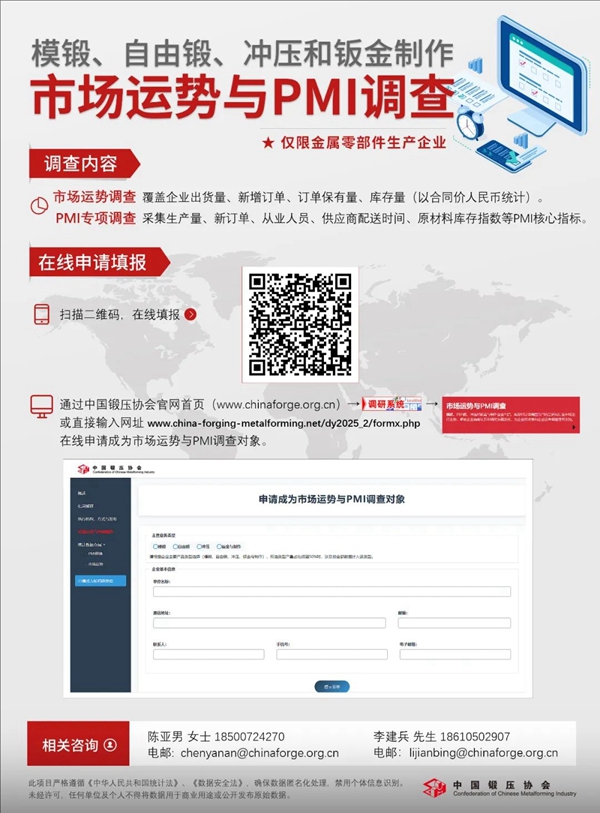行業動態與風險預警 積極信號:需求結構性改善 新能源訂單持續增長:40%企業新訂單上升,與4月頭部企業新能源訂單+30%趨勢一致,反映風電/光伏鍛件需求韌性。 出口韌性顯現:出口訂單增加,抵消部分貿易摩擦風險。 核心風險:生產收縮與成本壓力 生產活動收縮:40%企業生產量持平,20%減少,產能利用率或低于4月(75%)。原因:原材料成本上升(鋼鐵/鋁價環比+3.2%)壓制中小鍛企利潤。 貿易摩擦沖擊:部分樣本企業對美訂單減少,印證"機電產品關稅沖擊"風險(占模鍛出口60%+)。 企業策略建議 短期:控庫存+鎖成本 原材料庫存:維持低庫存策略(指數40.0),利用PPI通縮(-3.3%)議價采購。 成本管控:申請設備更新專項貸款貼息(如高精度液壓鍛錘抵稅15%)。 中期:綁定高增長賽道 新能源訂單:切入一體化壓鑄供應鏈(如光伏結構件、4680電池殼體)。 區域協同:優先布局產業集群區(配送效率提升60%)。 結論:弱擴張下的轉型窗口期 5月PMI 50.5表明行業延續弱擴張,但產需再平衡與成本壓力構成核心挑戰。 樂觀點:新訂單指數改善(60.0)為下半年提供需求支撐。 風險點:若生產指數持續低于50,可能觸發被動減產。 轉型路徑:短期抓政策紅利(設備抵稅+綠色信貸),中長期深耕新能源賽道與數字化技改。 特別鳴謝參與本次PMI報告數據調查的行業企業,感謝各企業對推動模鍛行業高質量發展做出的貢獻與努力!
