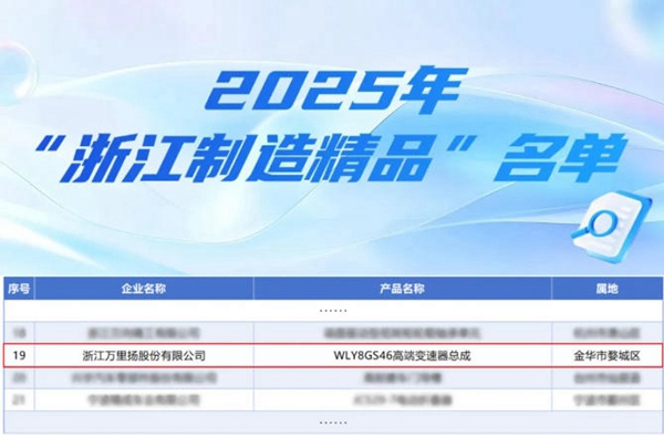 近日,浙江省經濟和信息化廳公布了2025年“浙江制造精品”名單,萬里揚WLY8GS46高端變速器總成榮膺其中。