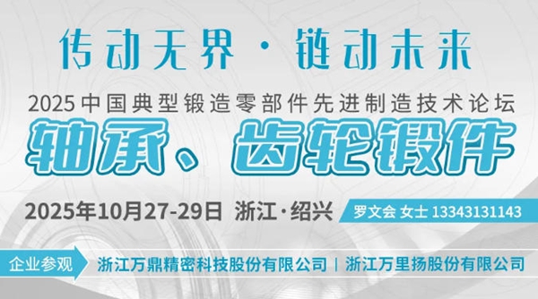 2025年10月29日,“2025中國典型鍛造零部件先進制造技術(shù)論壇--軸承、齒輪鍛件”專題論壇的參會代表將有機會走進萬鼎精密,感受精密鍛造生產(chǎn)新標桿的現(xiàn)場魅力。 ![]()