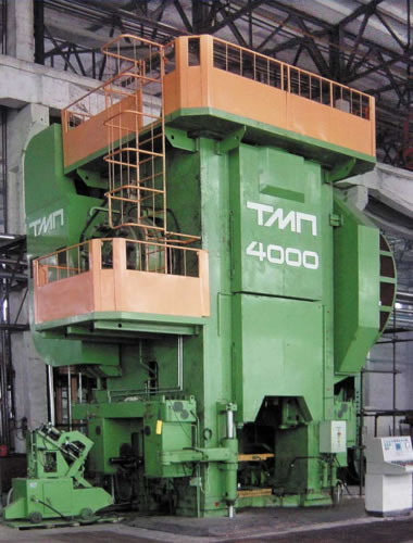南汽鍛造2005年引進的4000熱模鍛壓力機,生產效率高、操作簡單、維修方便、適合公司的自動化鍛造流水線。這臺熱模鍛壓力機打擊速度快,模具熱接觸時間短。采用上、下頂料設計,拔模斜度減小、節約鍛材、鍛件質量好。