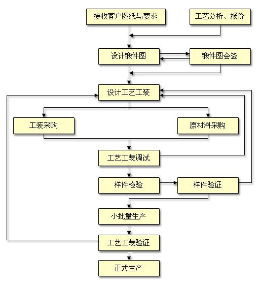南汽鍛造在新接訂單和產品開發過程中,廣泛采用計算機輔助設計與制造技術(CAD/CAM),對鍛件采用Pro-E軟件進行三維實體造型并分析。公司制定了嚴格的產品開發流程(如下圖),實施嚴密的產品開發先期策劃,保證了產品開發的快速高效: